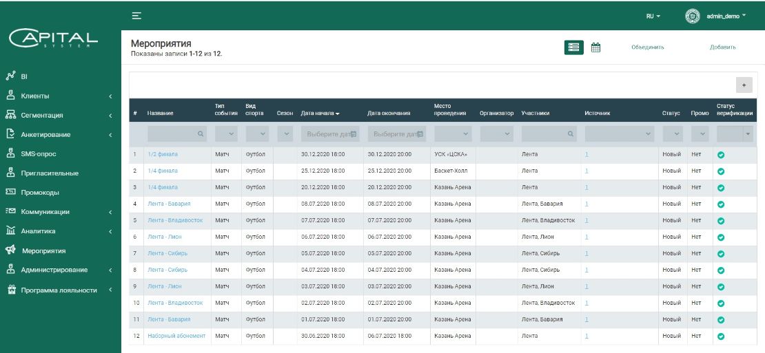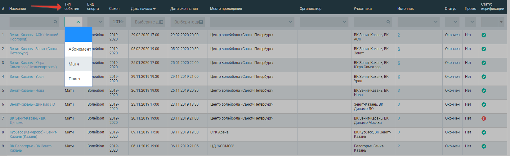 Также, кроме самих матчей, в разделе существуют такие типы событий как абонемент (для работы с самой лояльной аудиторией клуба) и пакет (определенный набор матчей, реализующийся единоразово, например, для еврокубковых турниров).