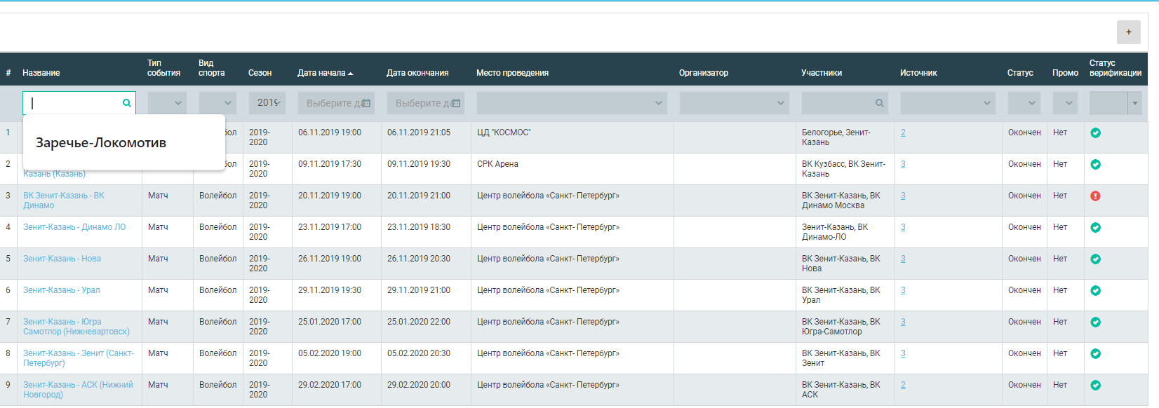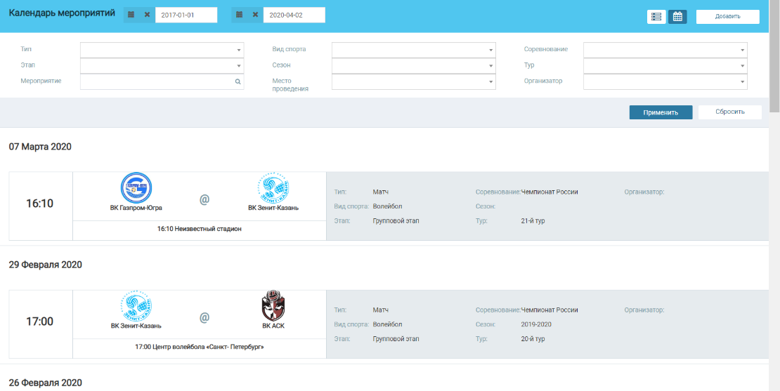 При переходе в данный раздел открывается таблица со списком мероприятий.