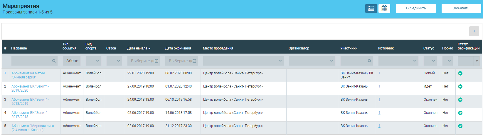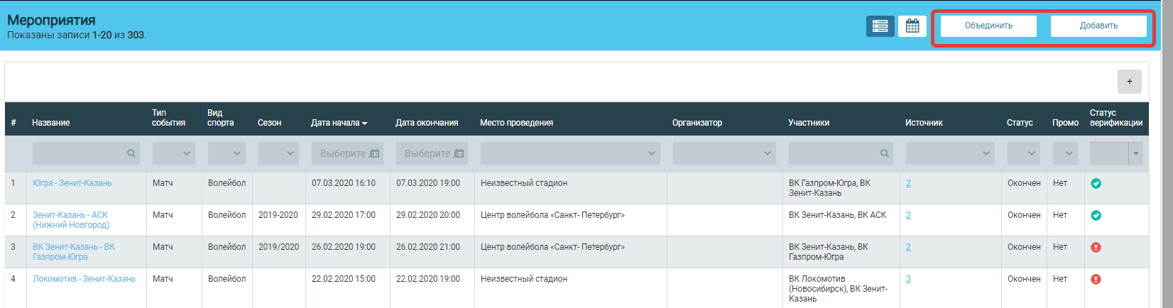 На странице с таблицей списка мероприятий вверху располагаются кнопки «Объединить» и «Добавить». При объединении мероприятий одному из них присваивается роль главного, а другому — дочернего. При нажатии на кнопку таблица меняет свой вид.