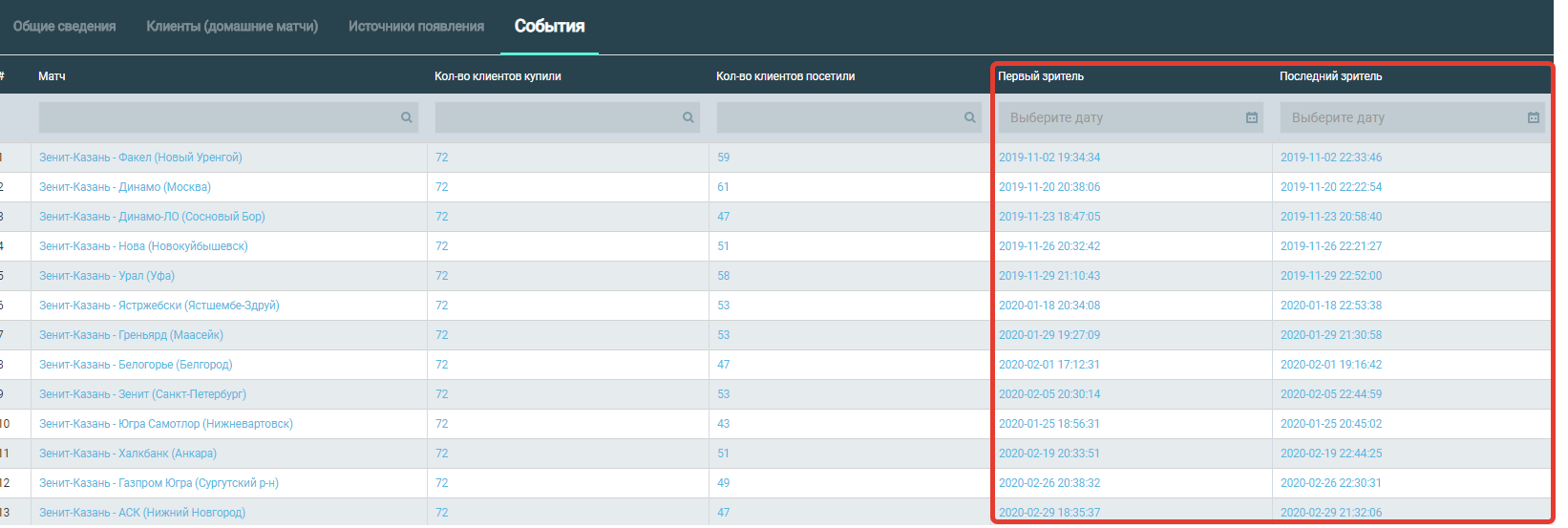 Нажав на соответствующее значение времени прохода первого зрителя откроется профиль клиента, который пришел на арену самым первым на выбранном матча. Аналогично можно перейти в профиль последнего зрителя, который посетил арену.
