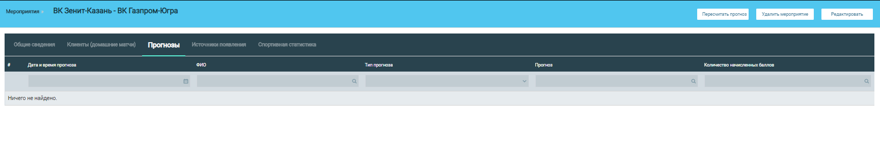 Во вкладке «Прогнозы» в табличном виде представлена информация о клиентах, которые дали свой прогноз на матч (доступно при наличии программы лояльности).