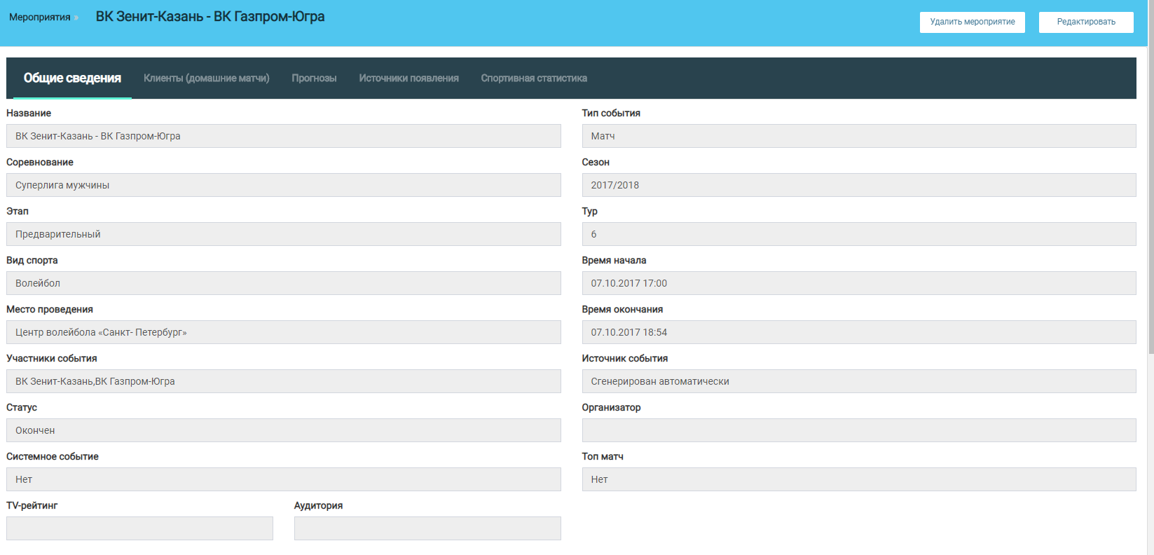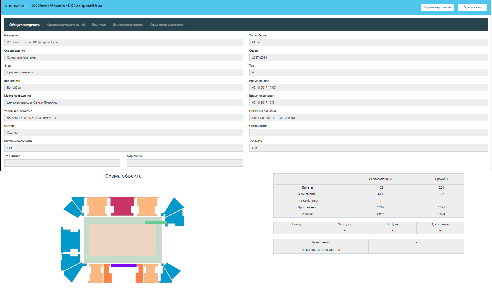 В правом верхнем углу расположена кнопка «Удалить мероприятие», при нажатии на которую будут удалены все мероприятия, в том числе и дочерние и все, что ссылается на эти мероприятия. Действие нельзя отменить. А кнопка «Редактировать» позволяет редактировать информацию в данном мероприятии. Вкладка «Общие сведения»: содержит основную информацию о матче, включая количество реализованных билетов, проходов, схему стадиона и погоду за несколько в день матча и за несколько дней до.