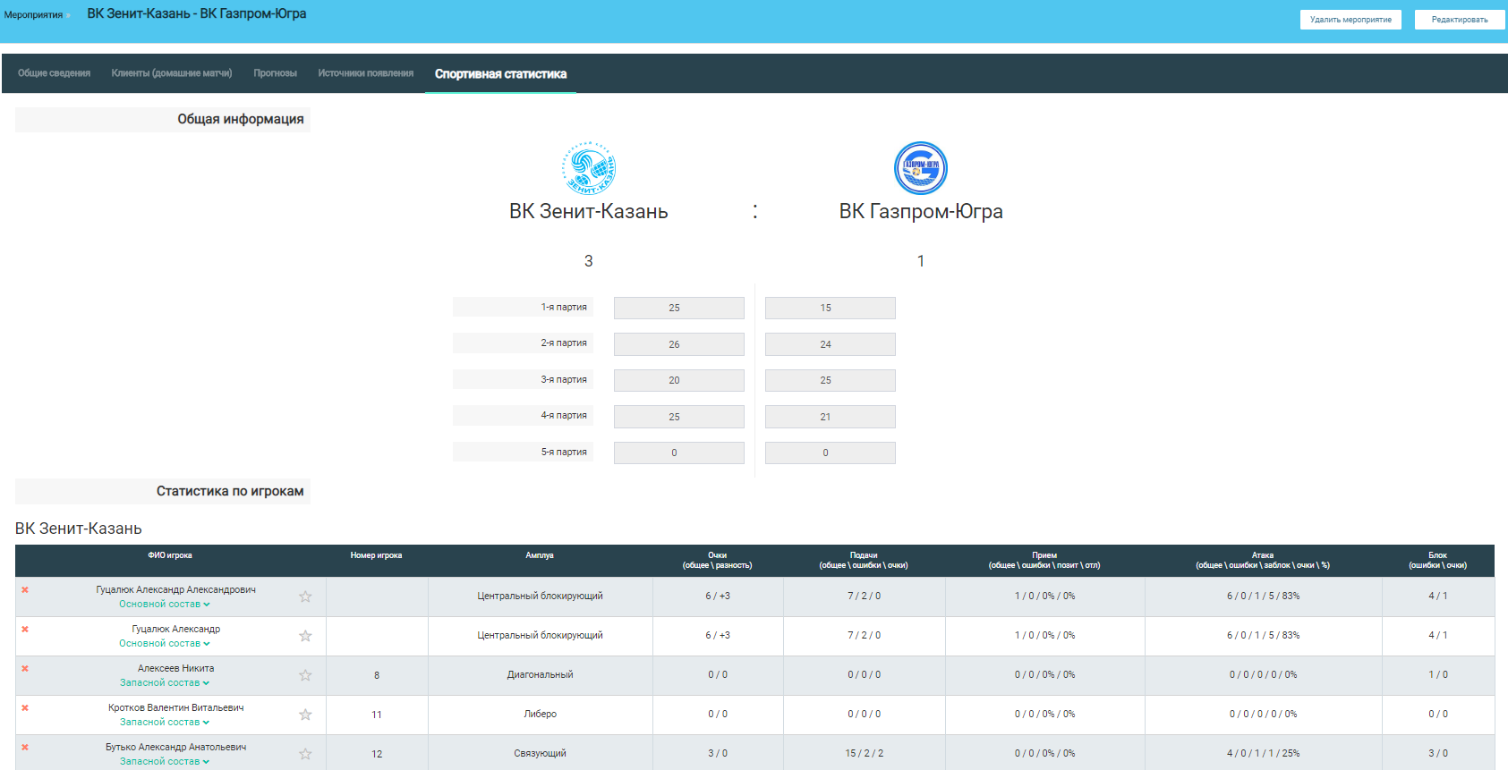 Вкладка «Спортивная статистика» содержит информацию о спортивных показателях рассматриваемого матча. Наполнение данными происходит либо автоматически, с помощью интеграции с публичным сайтом или вручную.