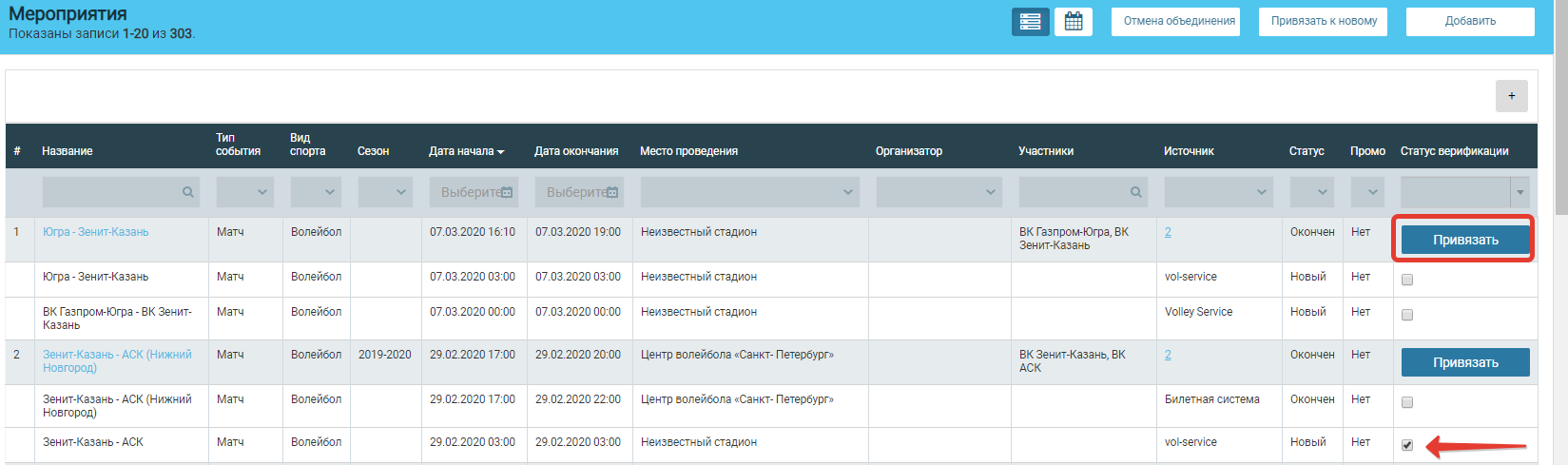 Для объединения мероприятий необходимо поставить галочку рядом с тем мероприятием, которому будет присвоена роль дочернего, затем необходимо нажать на кнопку «Привязать».
