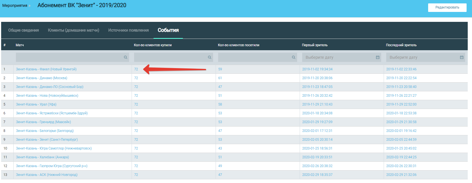 Для создания сегмента, например владельцев абонементов, которые посетили определенный матч, необходимо в столбце «Количество клиентов посетили» нажать на значение левой кнопкой мыши,