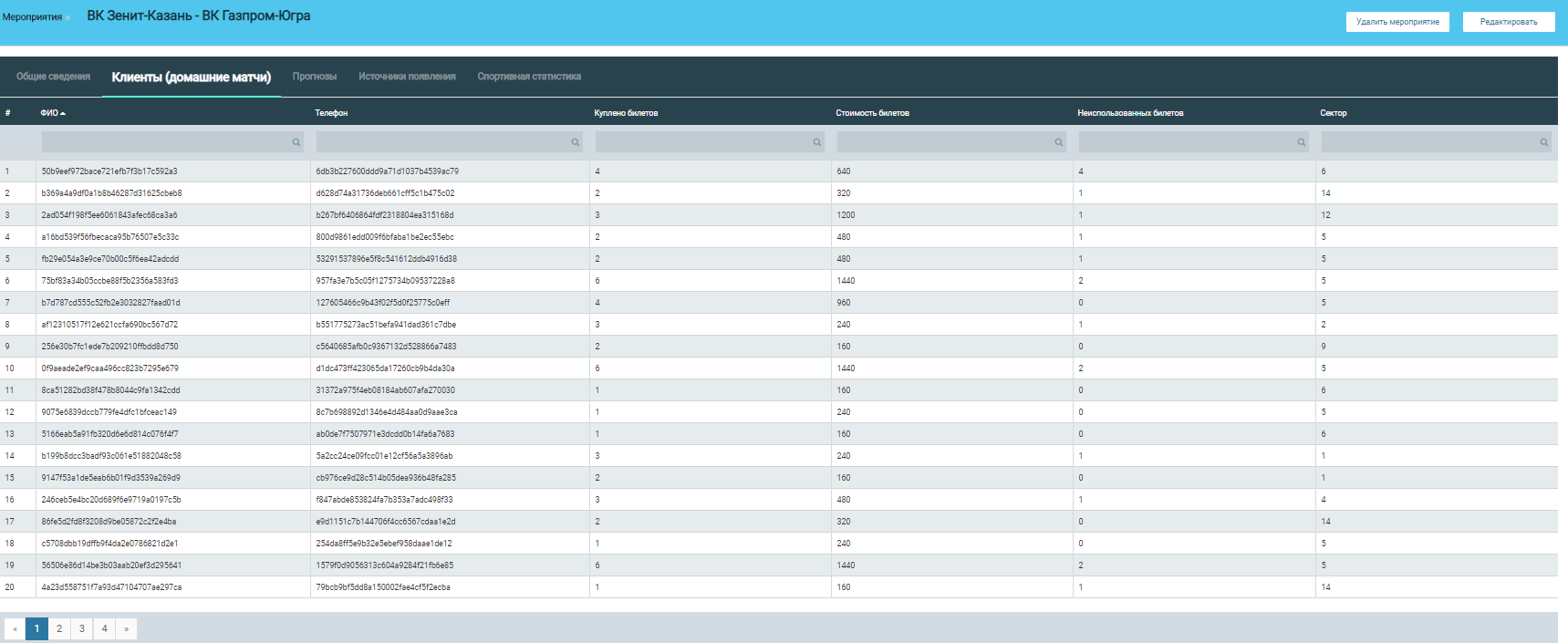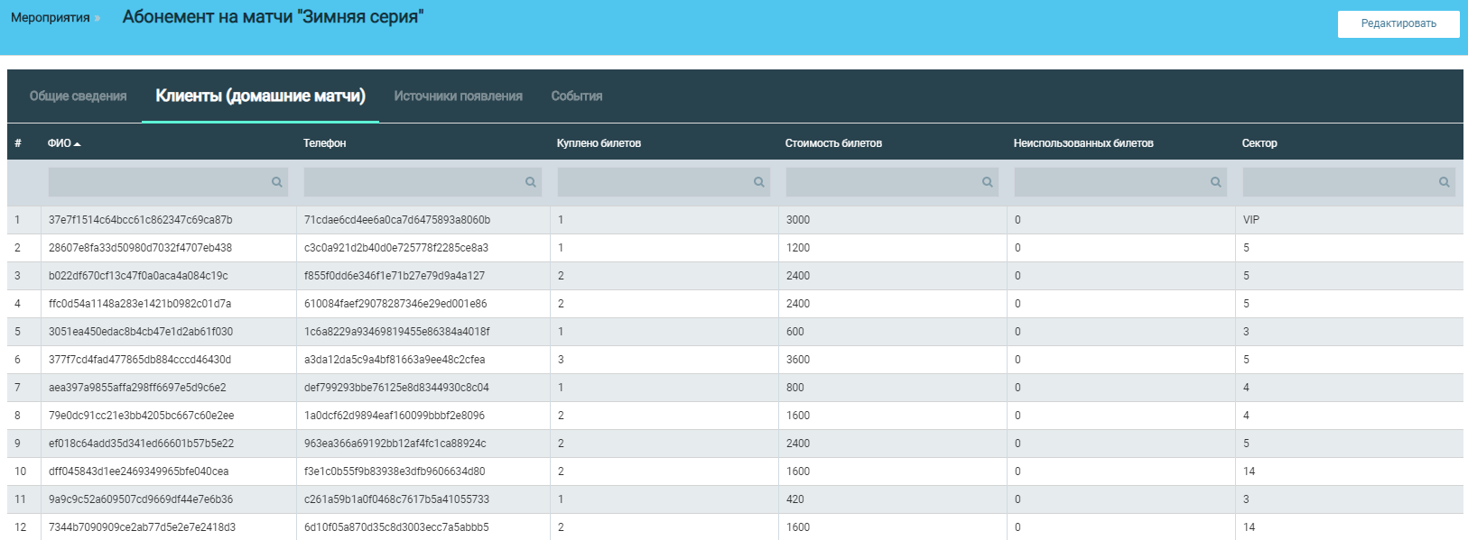 Вкладка «Клиенты (домашние матчи)» представлена таблицей, содержащей список владельцев абонементов определенного сезона с контактным номером телефона, указанным при оформлении абонемента (ов), количеством приобретенных абонементов, их суммарной стоимостью, а также сектором, на который был (и) куплен (ы) абонемент (ы).
