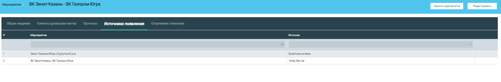 При нажатии на название матча можно перейти в просмотр подробной информации о нем. Имеются вкладки «Общие сведения», «Клиенты (домашние матчи)»/ «Клиенты (выездные матчи)», «Прогнозы», «Источники появления» и «Спортивная статистика».