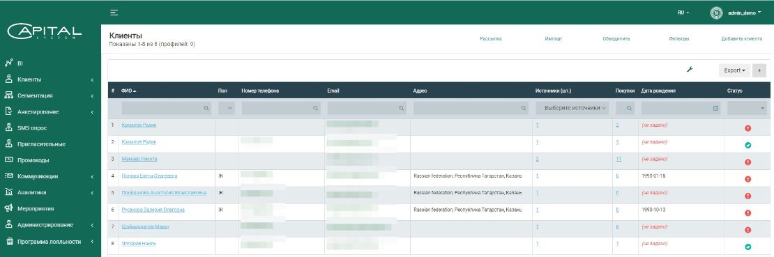 При переходе в подраздел «Список клиентов» откроется таблица со списком клиентов. Отображение разделов данной таблицы можно варьировать.