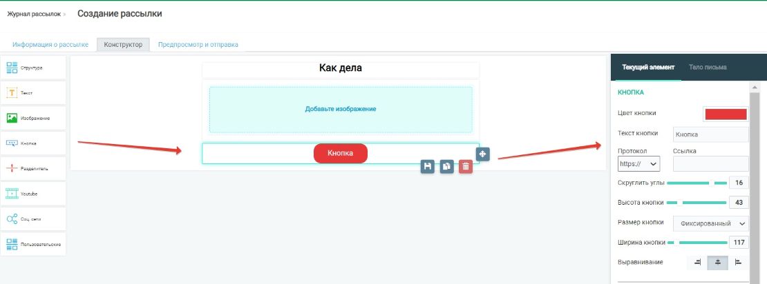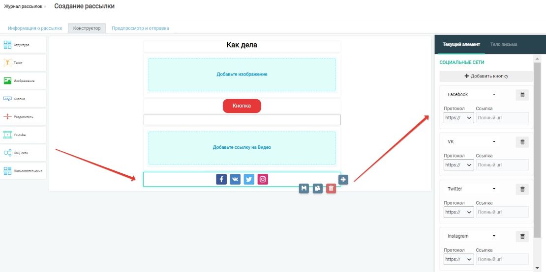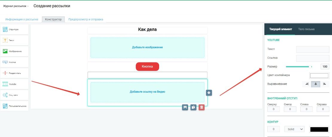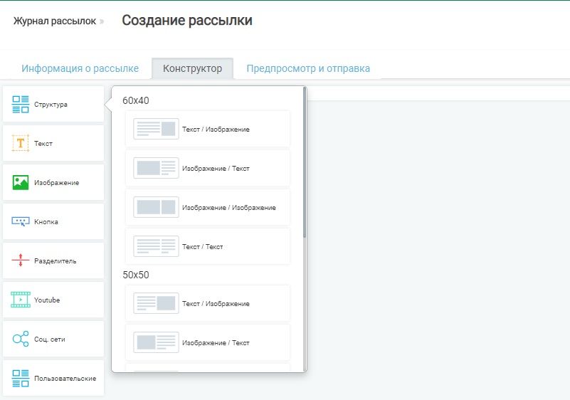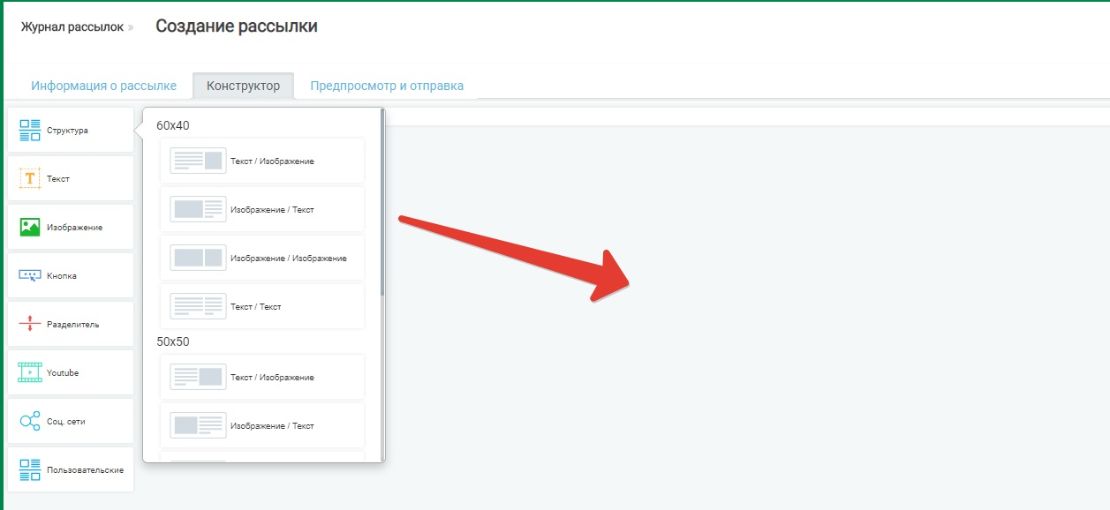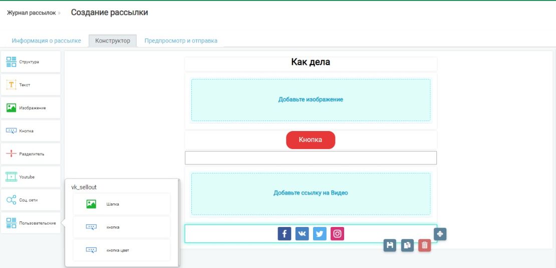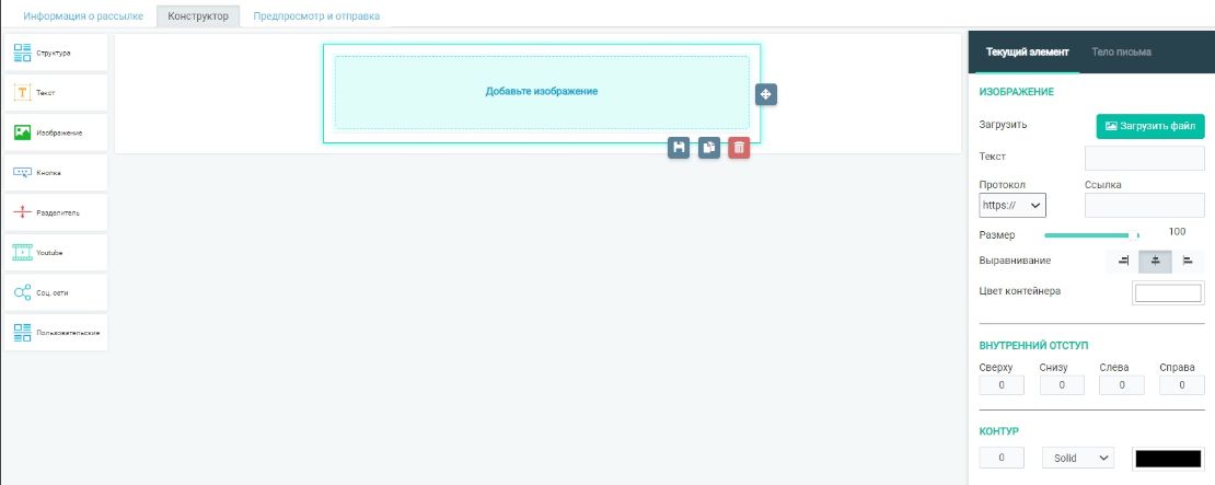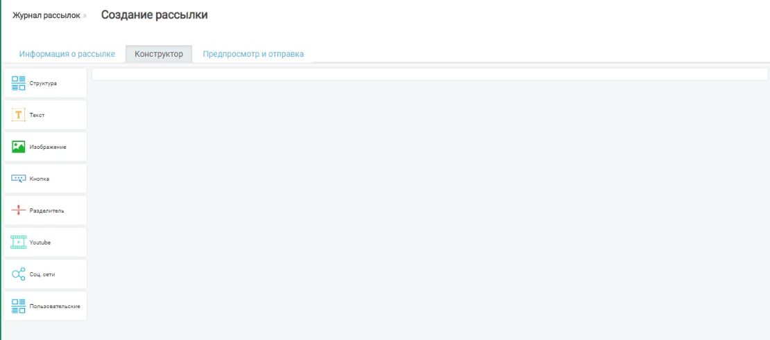 Для того, чтобы создать шаблон рассылки следует перейти в подраздел «Конструктор», при открытии которого открываются элементы для создания рассылки.