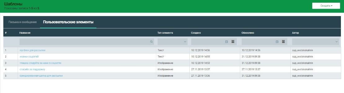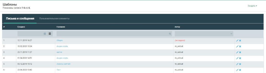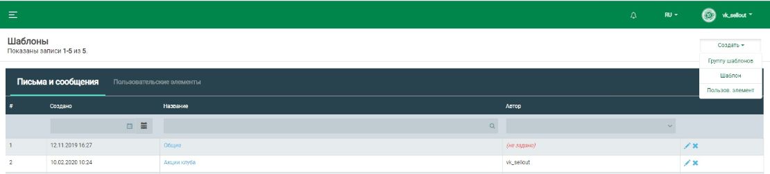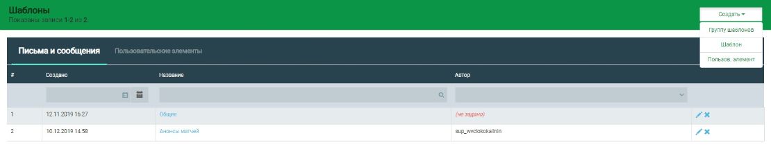 Основная страница Шаблонов состоит из таблицы с двумя вкладками:Письма и сообщения, в которой находятся группы шаблонов;Пользовательские элементы.