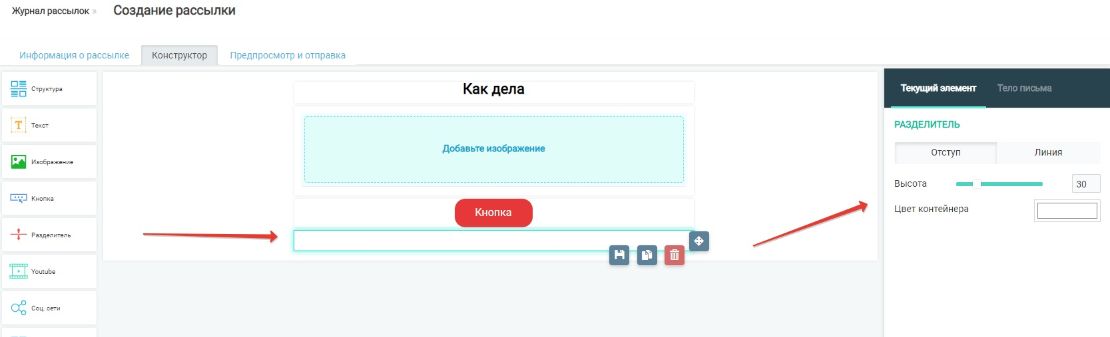 Следует обратить внимание на то, что после каждого блока Вашей рассылки необходимо перетаскивать кнопку «Разделитель» в шаблон рассылки, чтобы избежать наложения блоков друг на друга. Также Разделитель может быть оформлен в форме линии