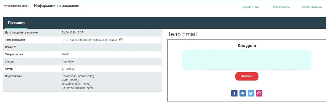 Черновик сохранится в журнале рассылок. Если нажать на тему черновика, можно посмотреть дополнительную информацию. В черновик возможно внести изменения, нажав на кнопку «Редактировать», или удалить.