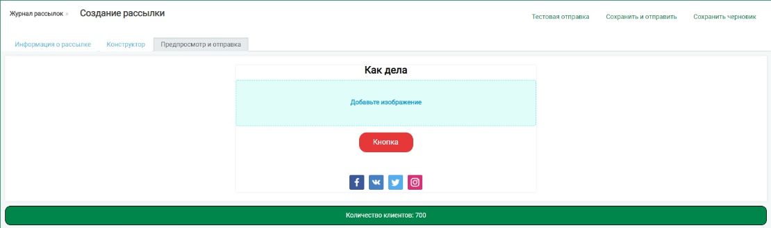 После заполнения этого раздела следует перейти в подраздел Предпросмотр и отправка. В этом подразделе необходимо проверить рассылку и нажать на кнопку «Сохранить и отправить».