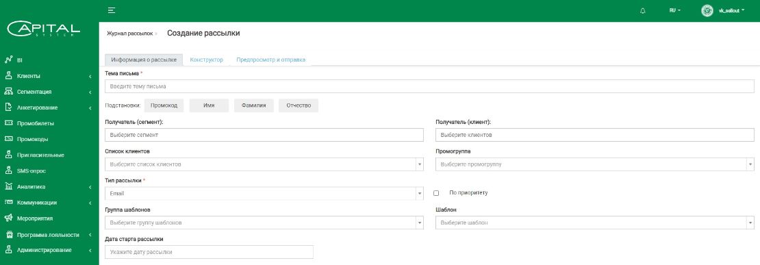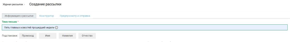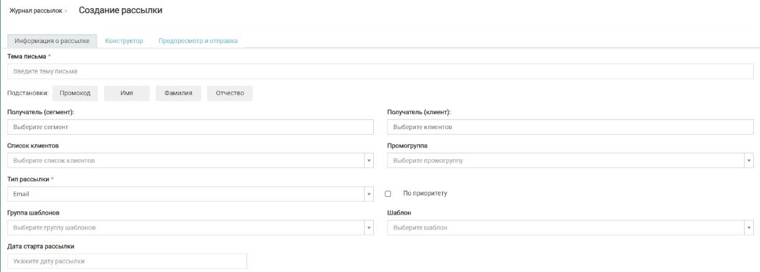 После нажатия на кнопку «Создать рассылку» открывается страница с тремя вкладками: «Информация о рассылке», «Конструктор», «Предпросмотр и отправка».