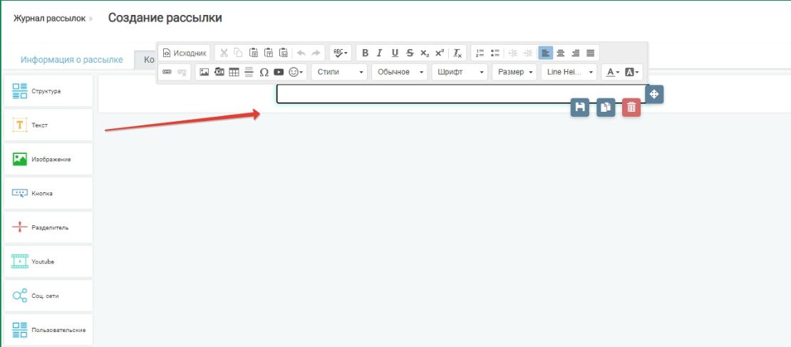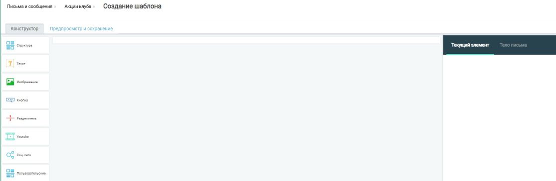 После нажатия на кнопку «Создать шаблон» появляется страница конструктора для создания шаблона рассылки.