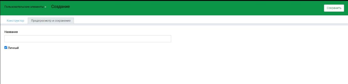 После создания элемента следует перейти в раздел «Предпросмотр и сохранение», в котором следует ввести название элемента и настроить его доступность: доступен только вам (Личный) или доступен всем пользователям кабинета, для этого соответственно в чекбокс ставится галочка или он остается пустым.