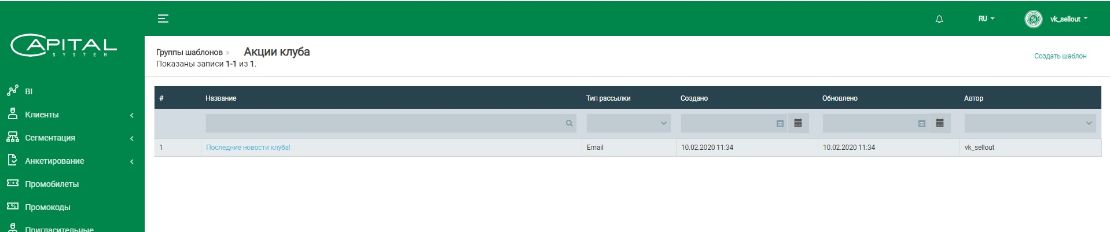 Для добавления нового шаблона в ранее созданную группу необходимо нажать на название группы в списке (в качестве примера – группы «Акции клуба»), а после – на кнопку «Создать шаблон», находящуюся в правом верхнем углу открывшейся страницы.