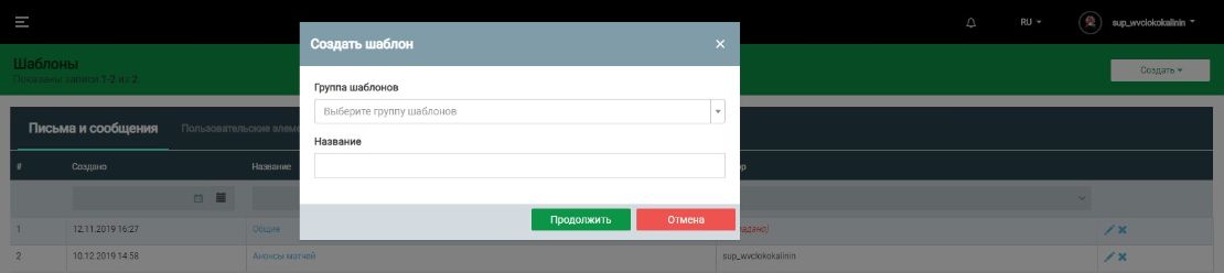 После заполнения полей выше необходимо нажать на кнопку «Продолжить». После чего откроется окно для создания шаблона рассылки