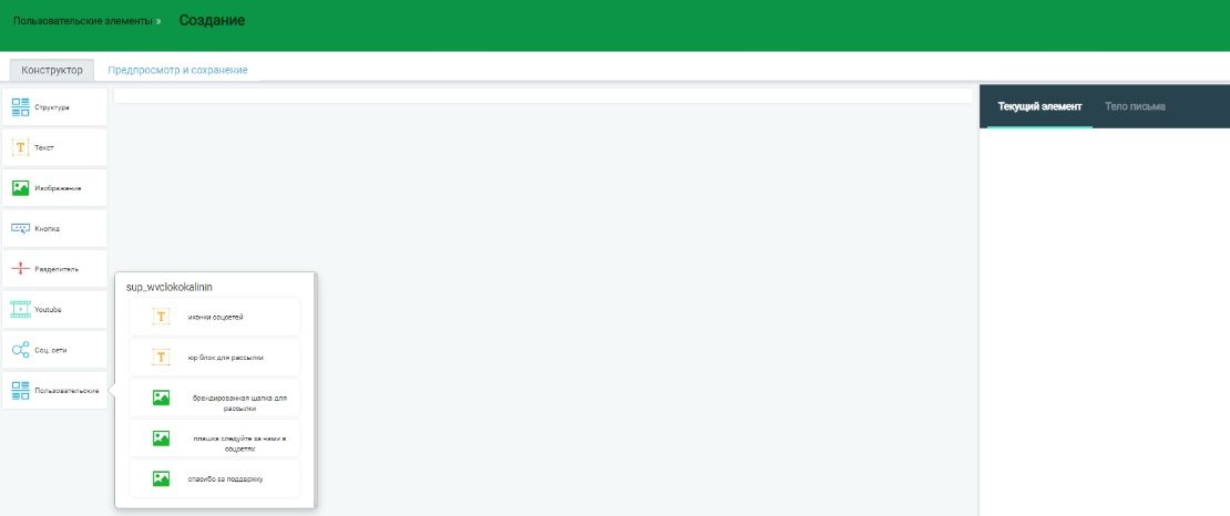 Все сохраненные пользовательские элементы доступны при создании рассылки или шаблона на вкладке «Конструктор» в конце списка элементов.