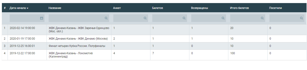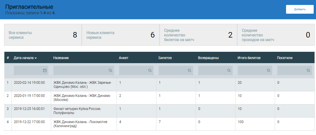 Если же у клиента поменяются планы или не будет возможности посетить матч, он сможет оформить возврат билета.Статистика раздела представлена различными показателями успешности применения пригласительных на том или ином событии в части как посещаемости матча, так и прироста новых клиентов.