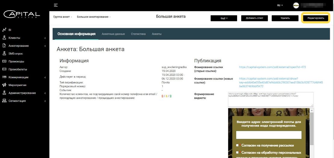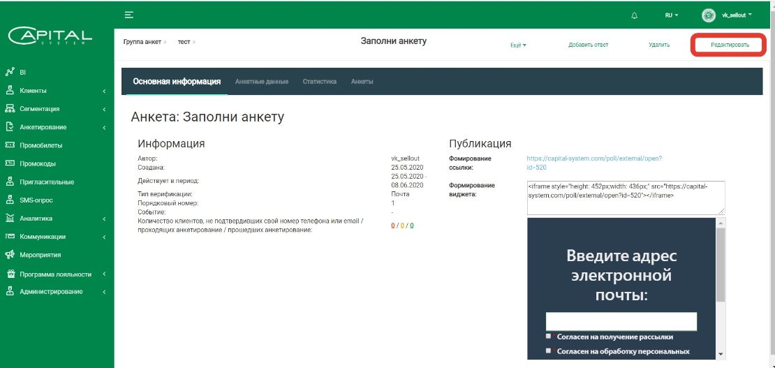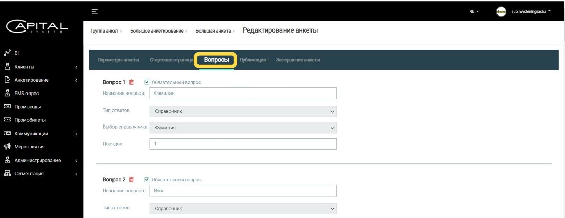 Для того, что бы поменять последовательность вопросов необходимо открыть раздел «Анкетирование», создать анкету или выбрать уже ранее подготовленную (не запущенную).Если анкета была подготовлена ранее, то необходимо открыть анкету, нажать на кнопку «Редактировать»