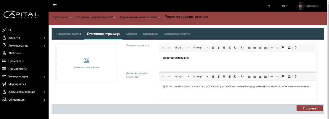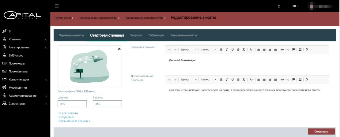 Для того, чтобы настроить размер изображения, которое будет использоваться в стартовой странице анкеты необходимо открыть ранее созданную анкету или перейти в блок «Стартовая страница», если вы создаете анкету прямо сейчас.