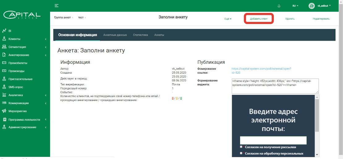 Для того, чтобы самостоятельно добавить ответ в анкету, необходимо на странице анкеты нажать на кнопку - «Добавить» , которая находится в правом верхнем углу страницы.