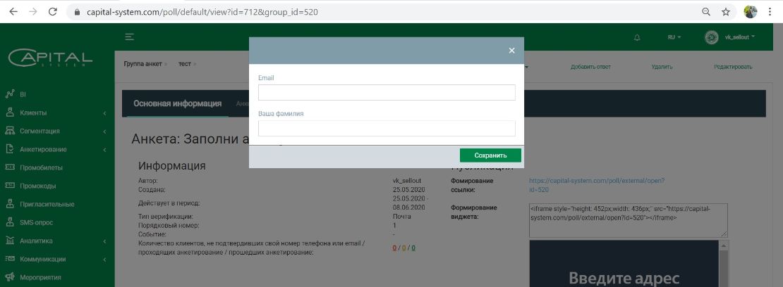 При нажатии на кнопку «Добавить ответ» появляется окно для ручного ввода результатов анкетирования клиента. Нажав на кнопку «Сохранить», клиент появится в списке клиентов, уже прошедших анкету.Если клиент ранее был записан в системе, то в его профиль добавится информация о прохождении анкеты. Если же клиента в системе не было, то он запишется как новый.