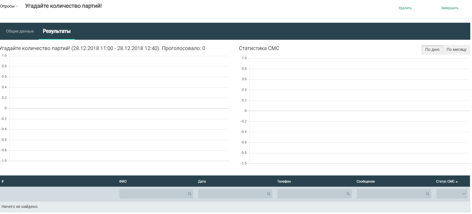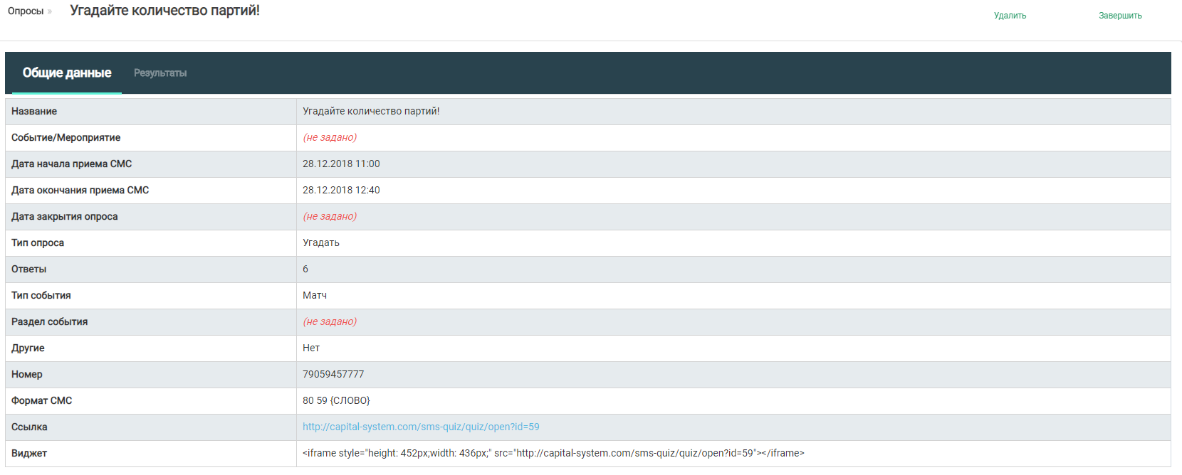 Если нажать на данный опрос в таблице, можно перейти к подробному просмотру информации о нем. Подробная информация включает в себя две вкладки: «Общие данные» и «Результаты», в правом верхнем углу располагается кнопка «Удалить», при нажатии на которую появляется диалоговое окно для подтверждения действия.