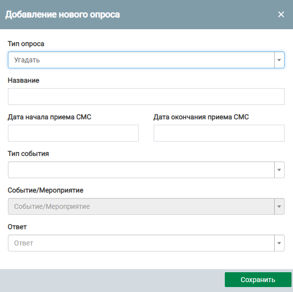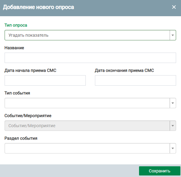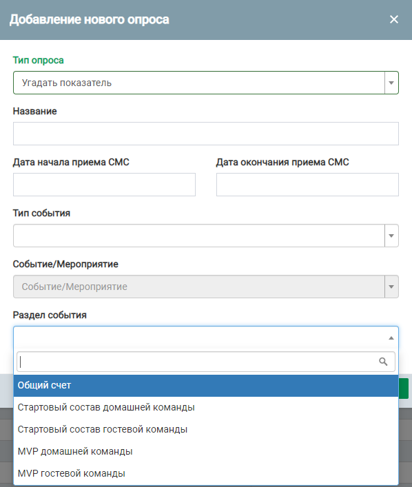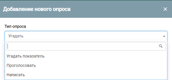 При создании типа опроса «Угадать показатель» вместо поля «Ответ» необходимо выбрать один из вариантов в выпадающем списке «Раздел события».