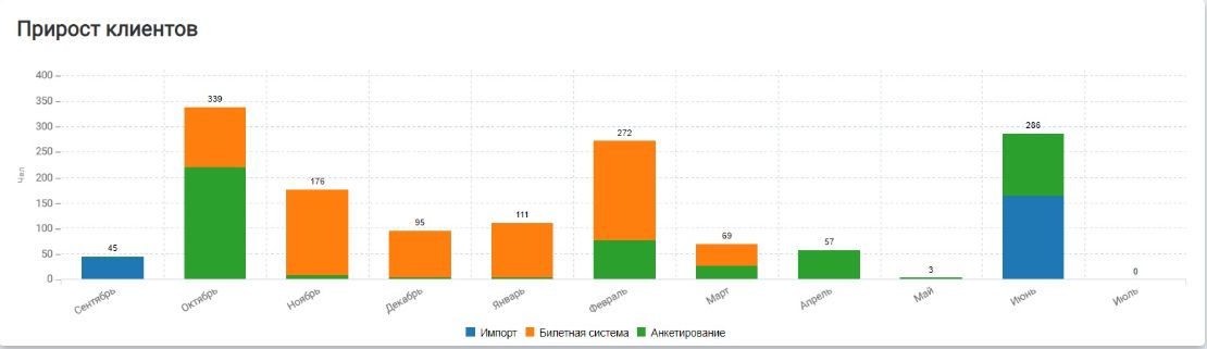 Показывает количество новых клиентов в разбивке по каждому месяца с разбивкой по источникам попадания в систему.