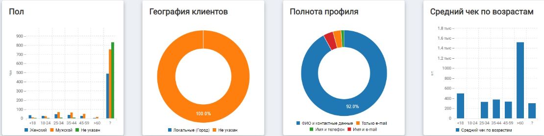Показывает наличие контактных данных в профилях клиентов. График строится только на основании указанных полей — ФИО, телефон, email. Например, если у болельщика в системе указаны ФИО и телефон, то он попадет в сегмент «Имя и телефон». Если у болельщика указан только email, то он попадет в сегмент «Только email».