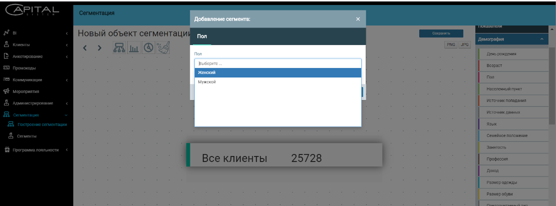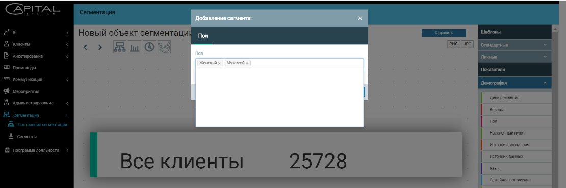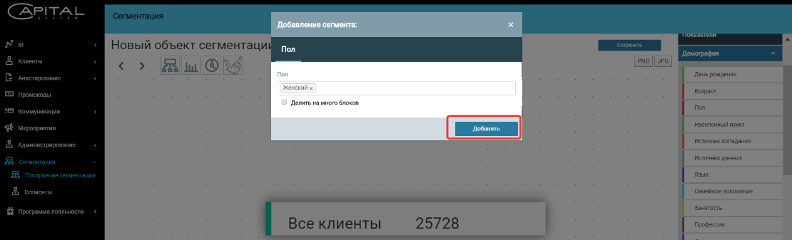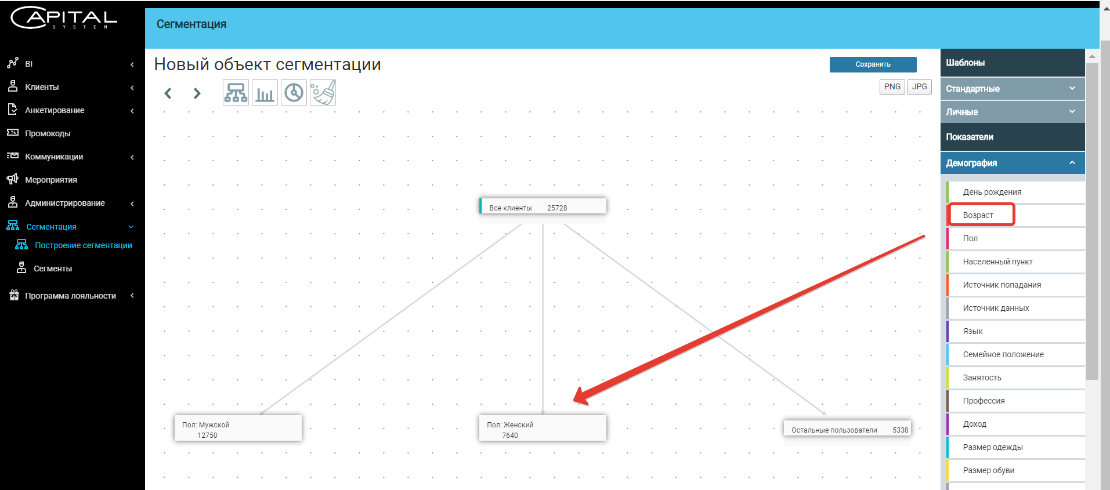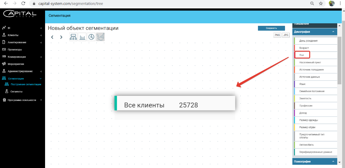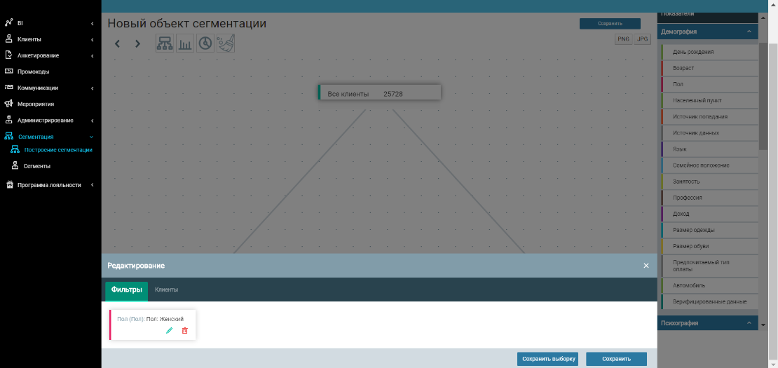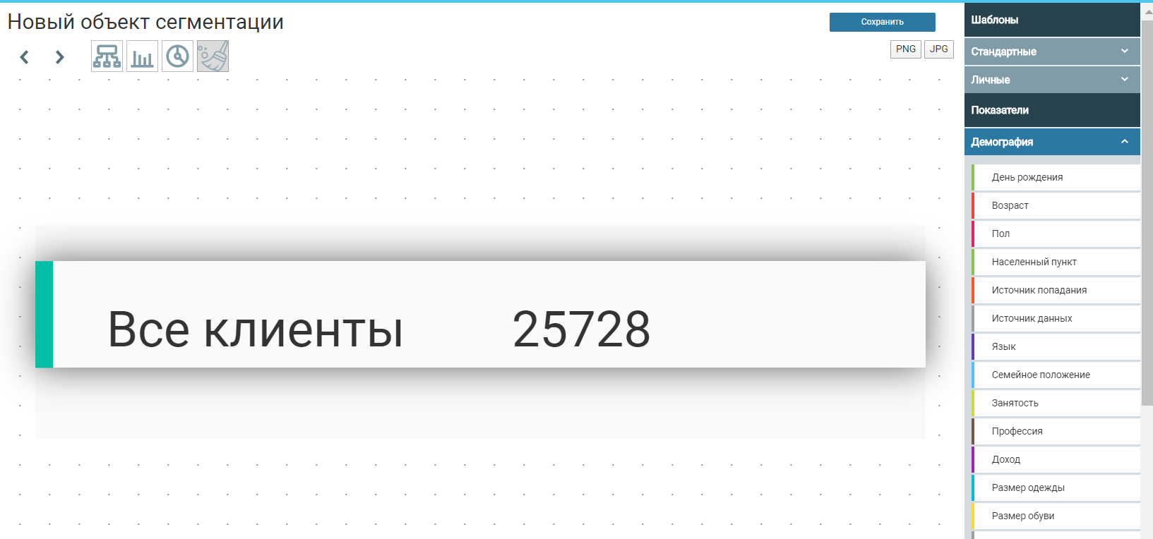 Для того, чтобы создать сегмент клиентов, необходимо выбрать нужный фильтр и перетащить его в рабочую область