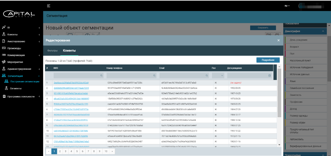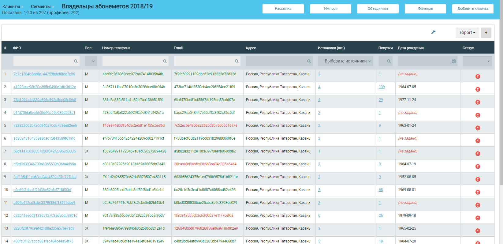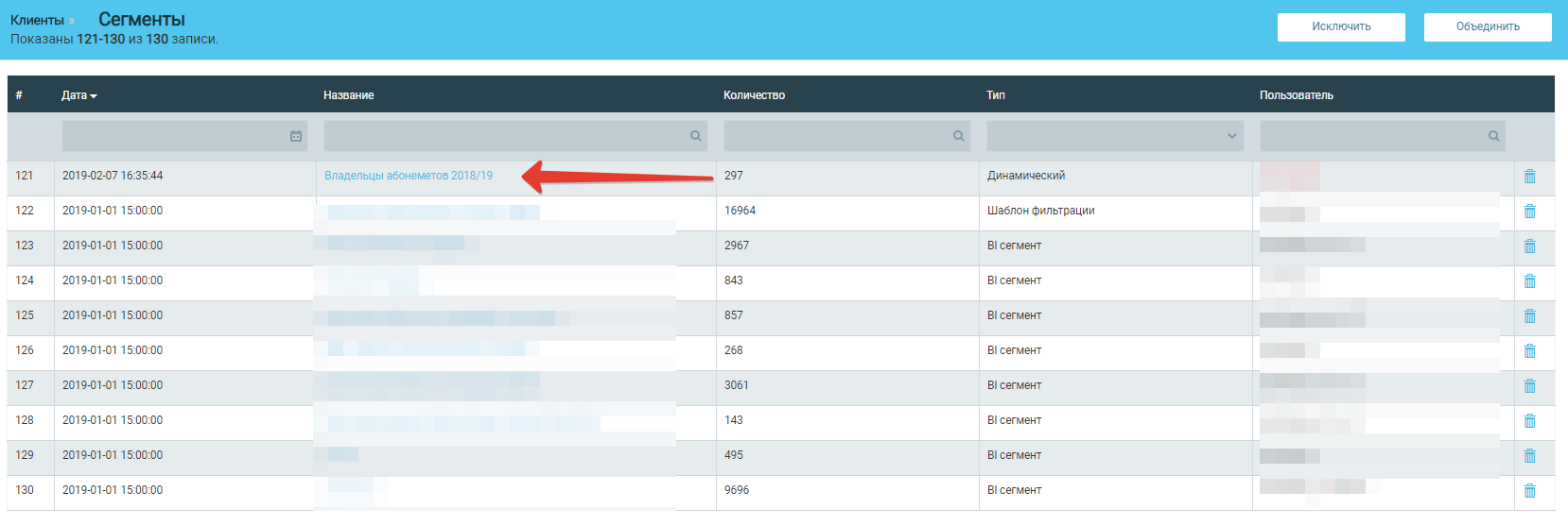 После выбора сегмента откроется список клиентов, которые входят в данный сегмент.