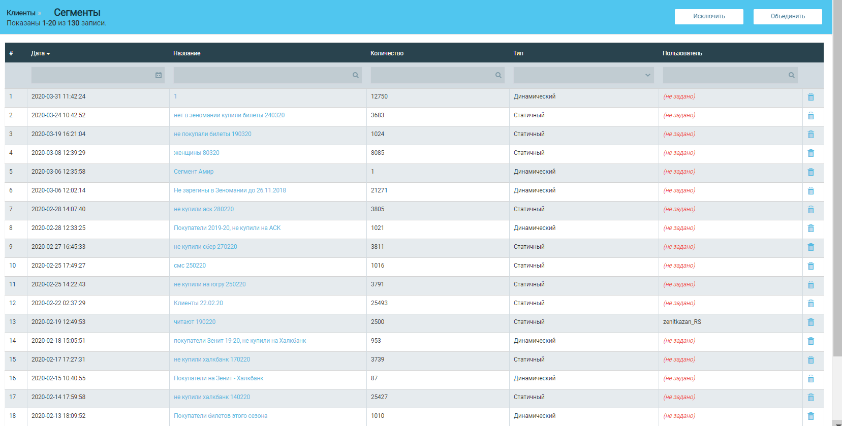 Все сохраненные сегменты клиентов хранятся в виде таблицы с датой и временем создания сегмента, названием, количеством клиентов, содержащихся в этом сегменте.