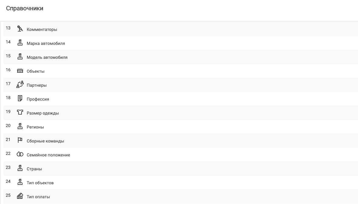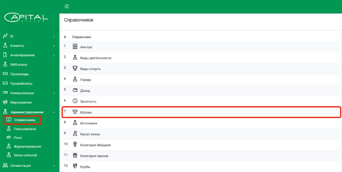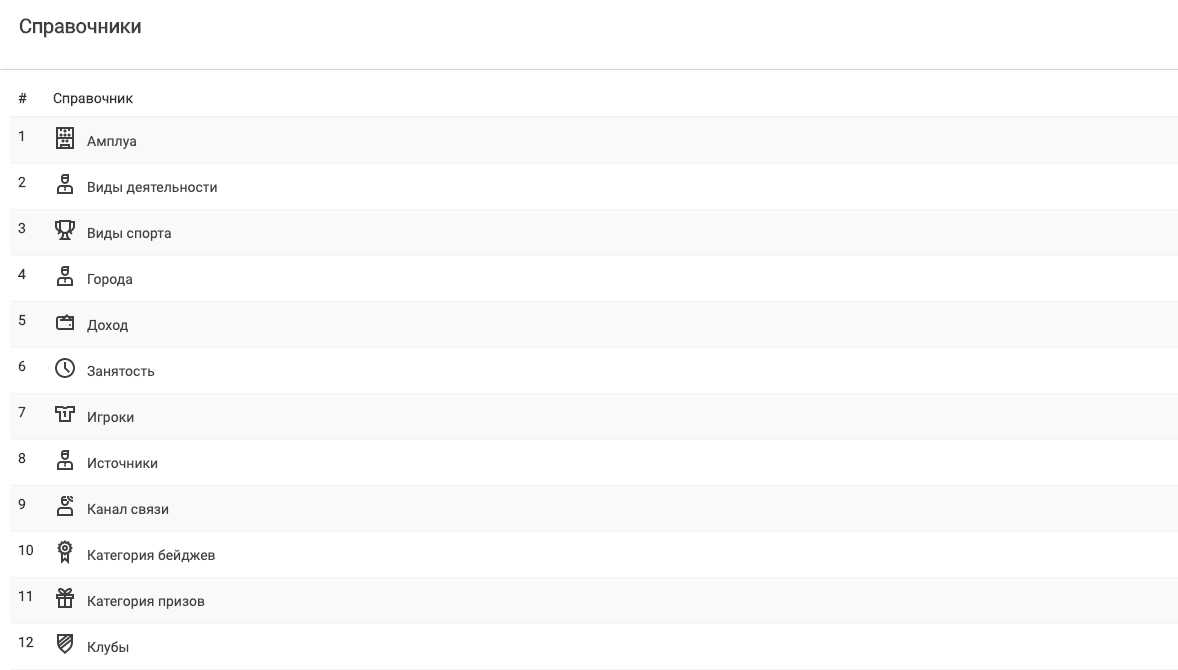 Для того, чтобы добавить не хватающую информацию в справочники (это может быть игрок, город, партнер клуба и т.д) необходимо перейти в подраздел «Справочники» и выбрать необходимый справочник (рассмотрим на примере добавления игрока):