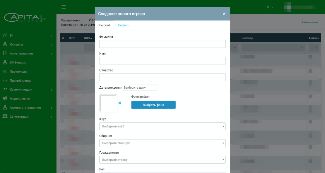 После открытия страницы справочника «Игроки», необходимо нажать на кнопку «Добавить игрока», которая находится в правом верхнем углу. Перед нами откроется окно создания нового игрока, в котором нужно ввести всю необходимую информацию: