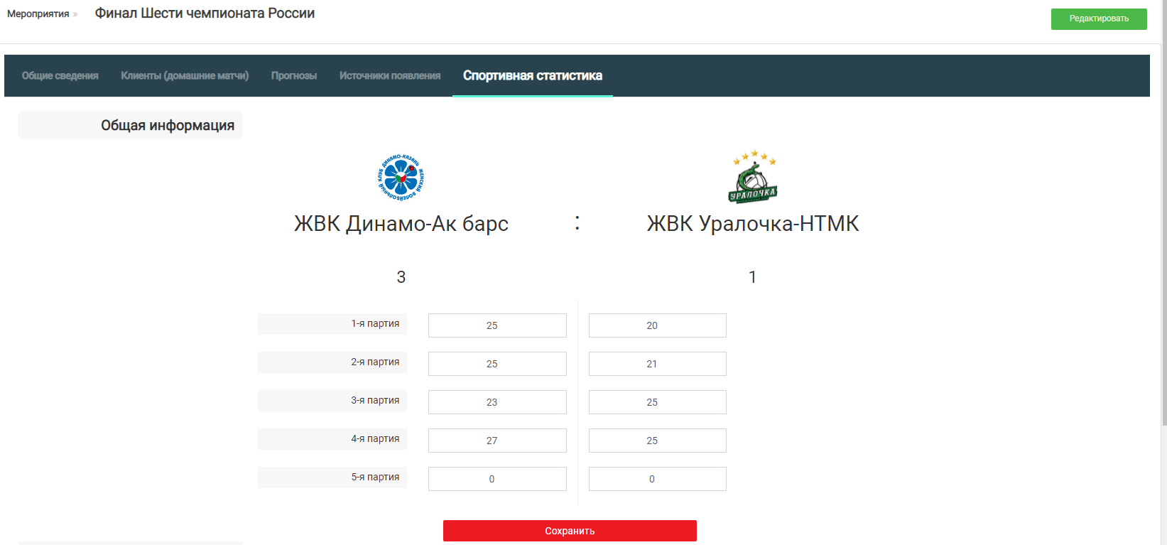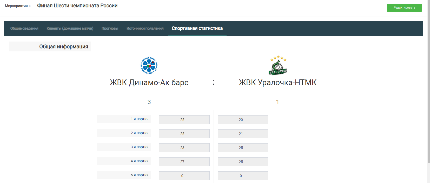 Для добавления или изменения информации о матче в программе лояльности Mania необходимо перейти в раздел «Мероприятия», выбрать нужный матч и нажать на кнопку «Редактировать».