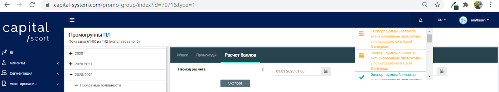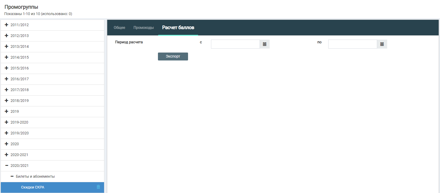 Для выгрузки статистики болельщиков по полученным баллам необходимо выбрать нужную промогруппу, перейти во вкладку «Расчет баллов» и выбрать период времени.
