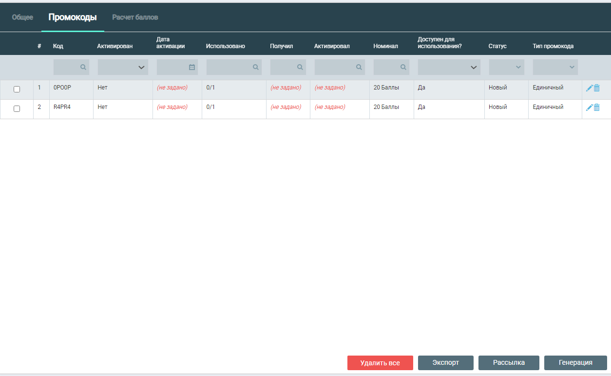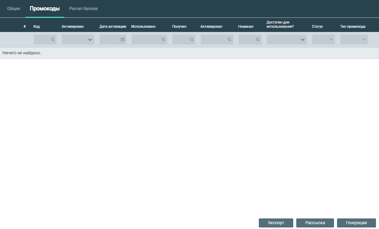 В открывшемся окне необходимо выбрать вкладку «Промокоды» и нажать на кнопку «Генерация».