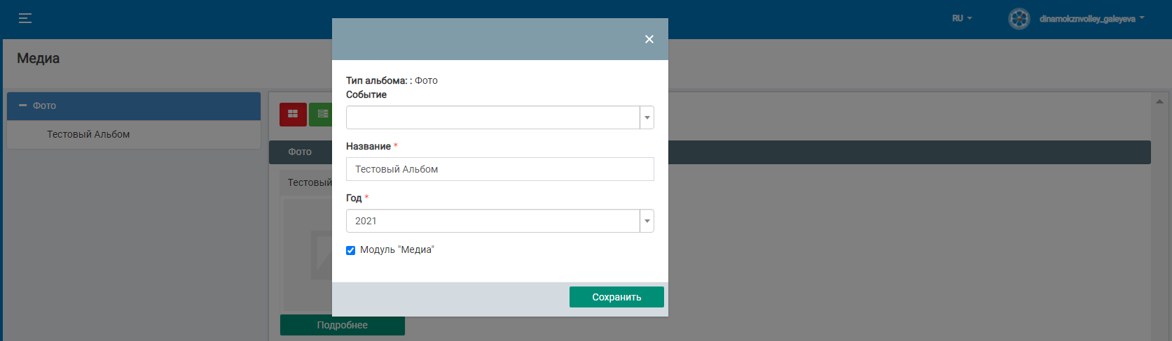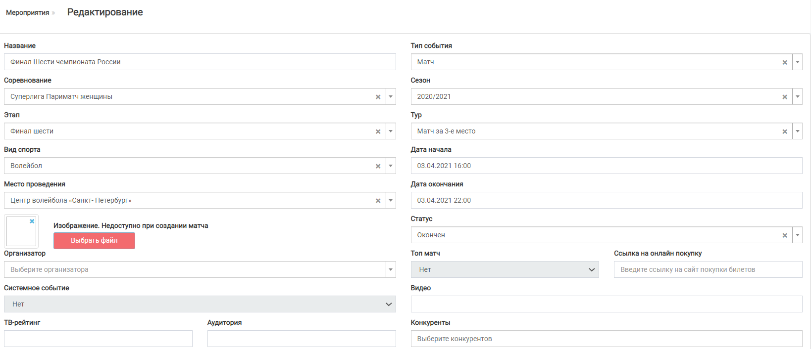 В открывшемся окне в поле «Событие» можно выбрать матч, например, к которому относится данный фоторепортаж, либо оставить данное поле пустым.