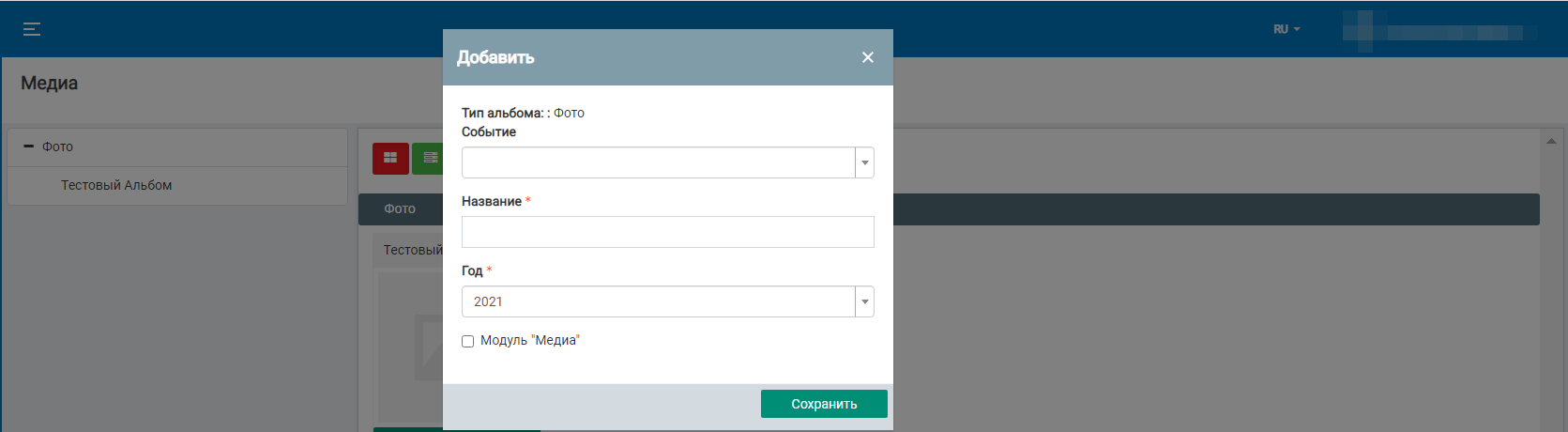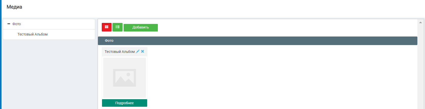 Для создания фотоальбома и добавления фото, необходимо открыть раздел «Медиа» и нажать на кнопку «Добавить».
