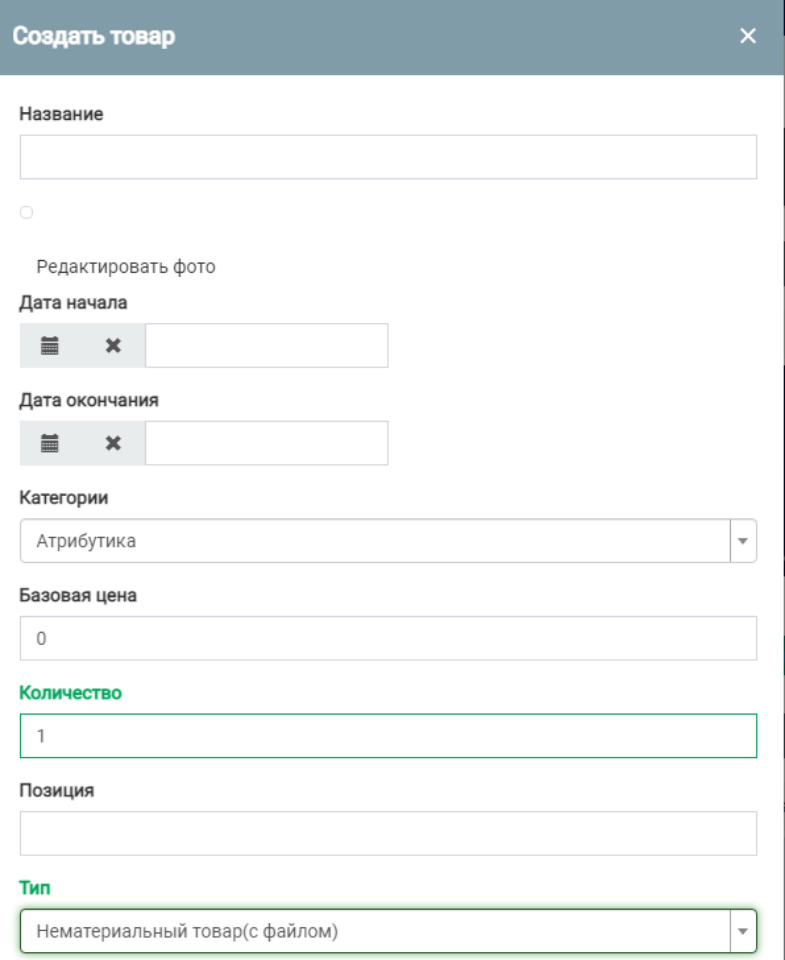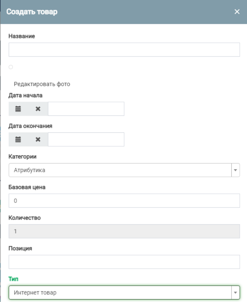 Для создания товара необходимо нажать на кнопку «Создать товар» и ввести следующие значения: