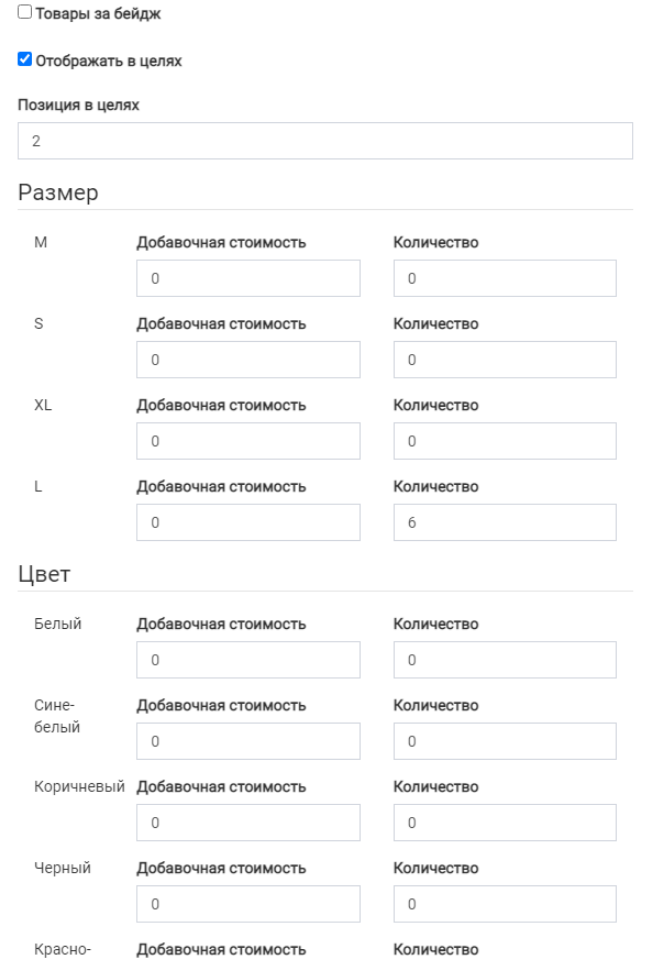 - Цвета (аналогичная механика, как с полем «Размер»);