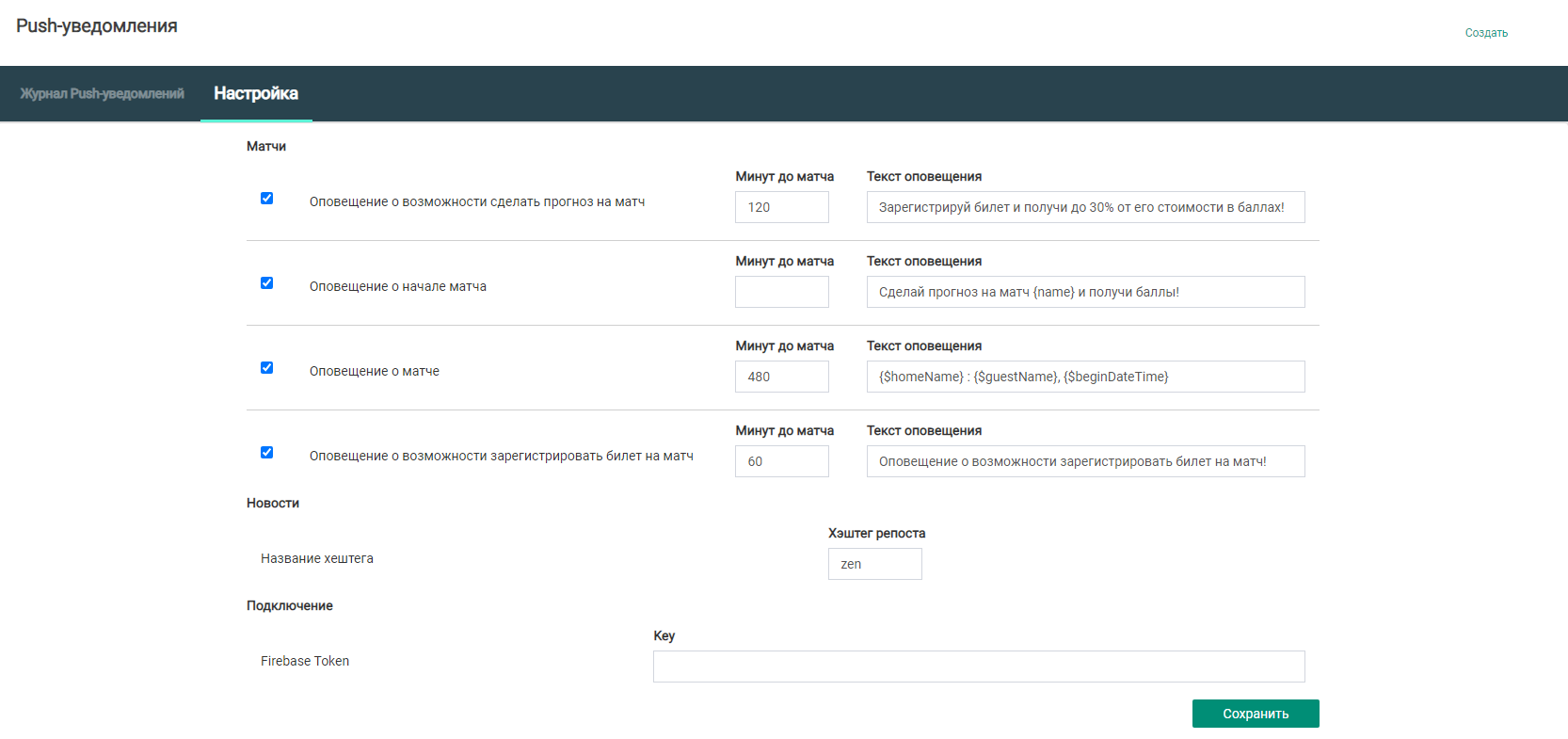 выбрать чек-боксы уведомлений, установить время, выбрать текст сообщения, указать хештег репоста новости, поле Firebase Token оставить без изменений и нажать на кнопку «Сохранить».