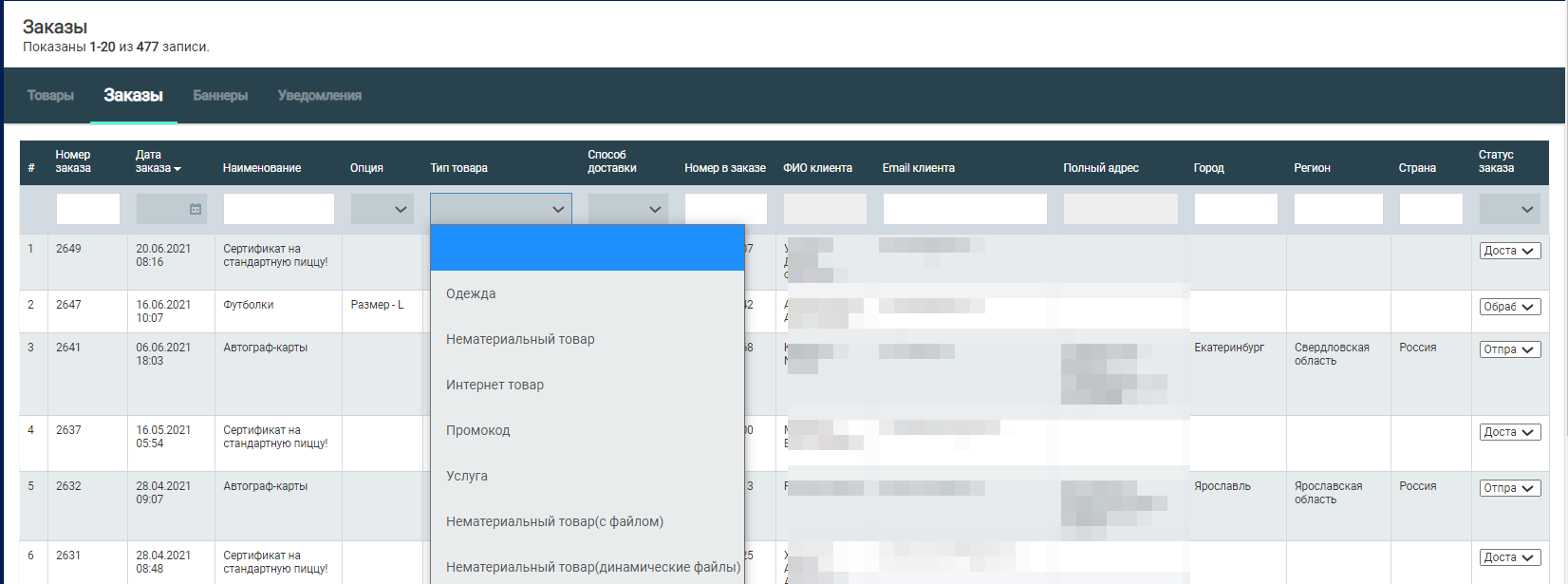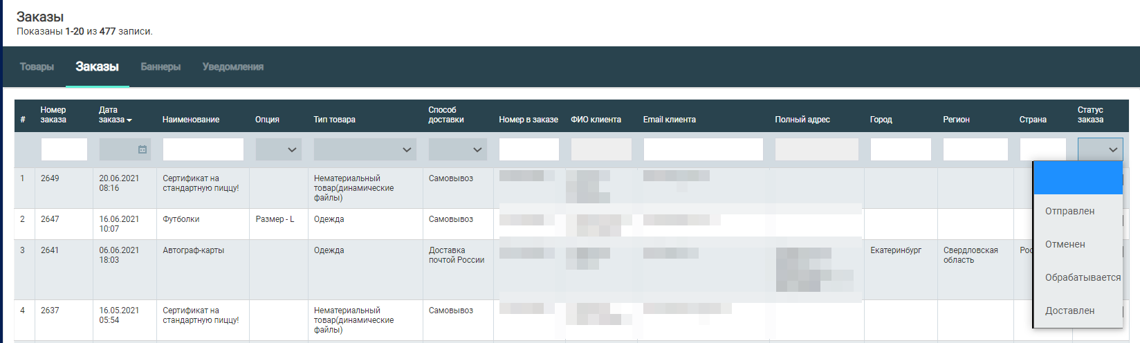 Если выбранный болельщиком товар имеет электронный тип доставки, статус меняется автоматически и не требует дополнительных изменений. В иных случаях необходимо проставлять корректные статусы в поле «Статус заказа».