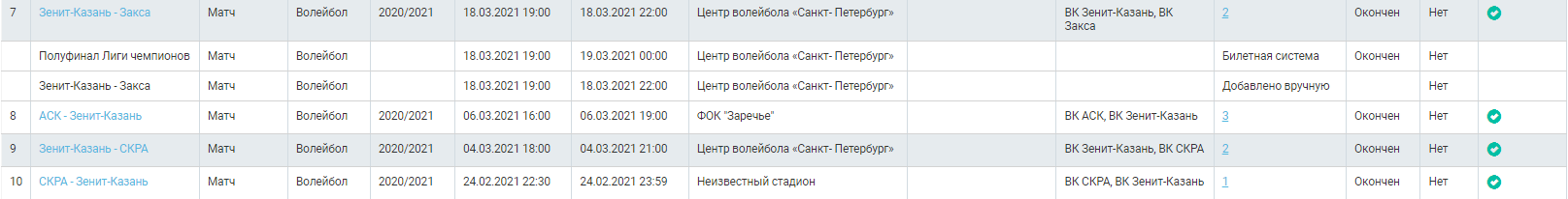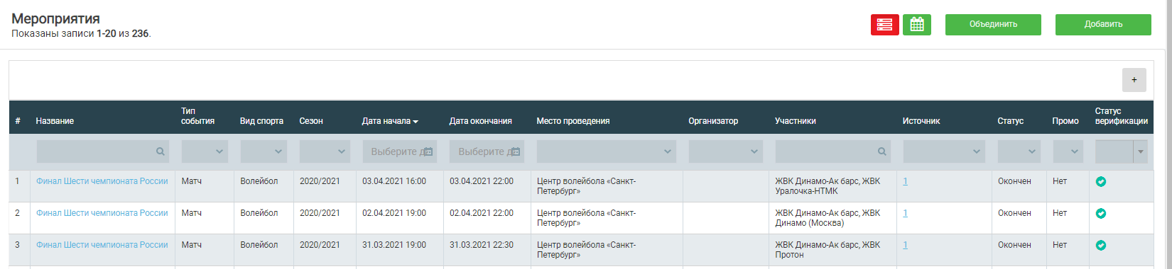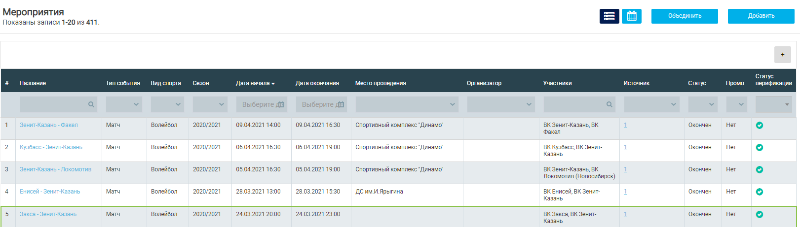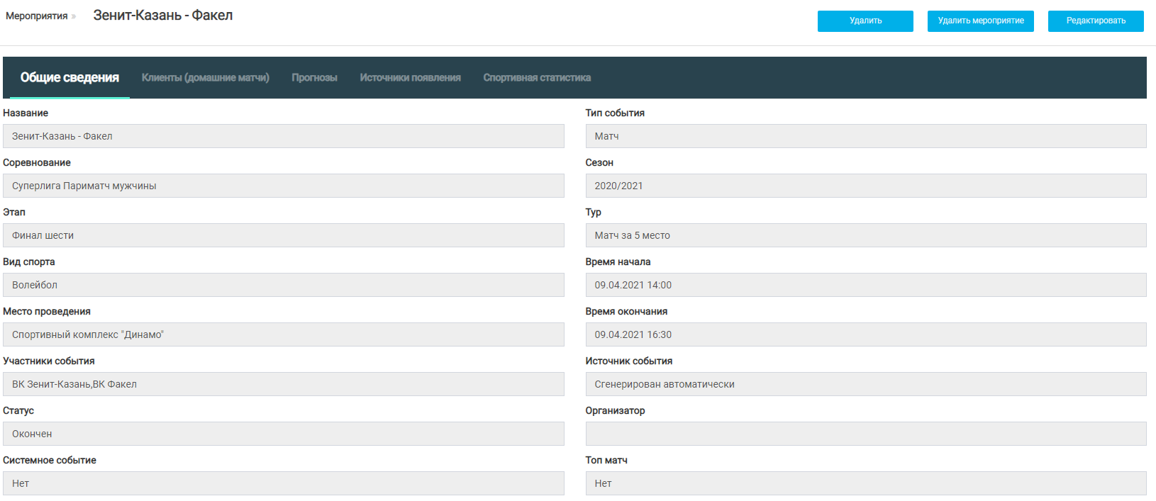 Для того чтобы устранить дублирование матчей в приложении, нужно перейти в раздел «Мероприятия», расположенный в главном меню, найти эти матчи и посмотреть источник их появления в системе, нажав на соответствующее поле «Источник».