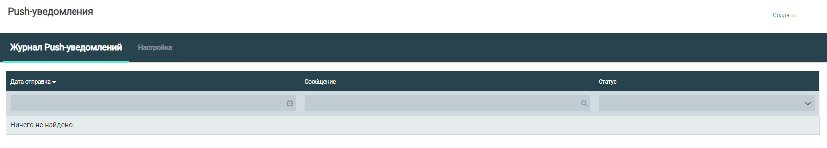 Для создания push-уведомления необходимо открыть раздел «Коммуникации», расположенный в главном меню, и перейти в подраздел «Push-уведомления», выбрать кнопку «Создать», находящуюся в правом верхнем углу,