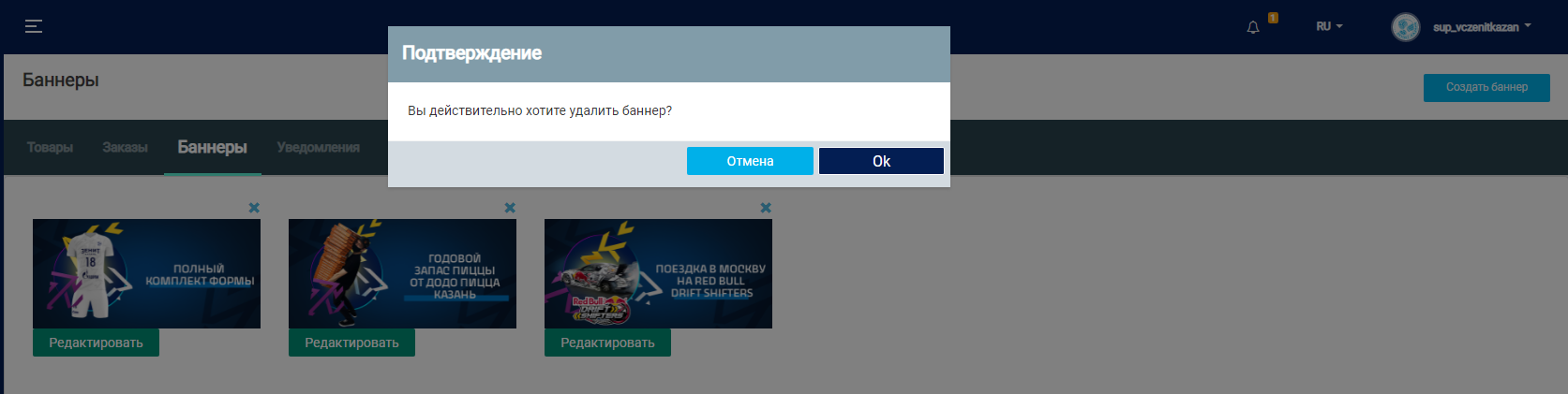 Для удаления ранее созданного баннера необходимо нажать на «крестик» рядом с баннером и подтвердить данное действие.