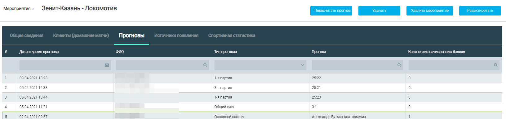 Если менеджер клуба не успел проставить показатели для подсчета баллов у болельщиков или баллы рассчитались некорректно, в разделе «Мероприятия» можно воспользоваться функцией «Пересчета прогноза».